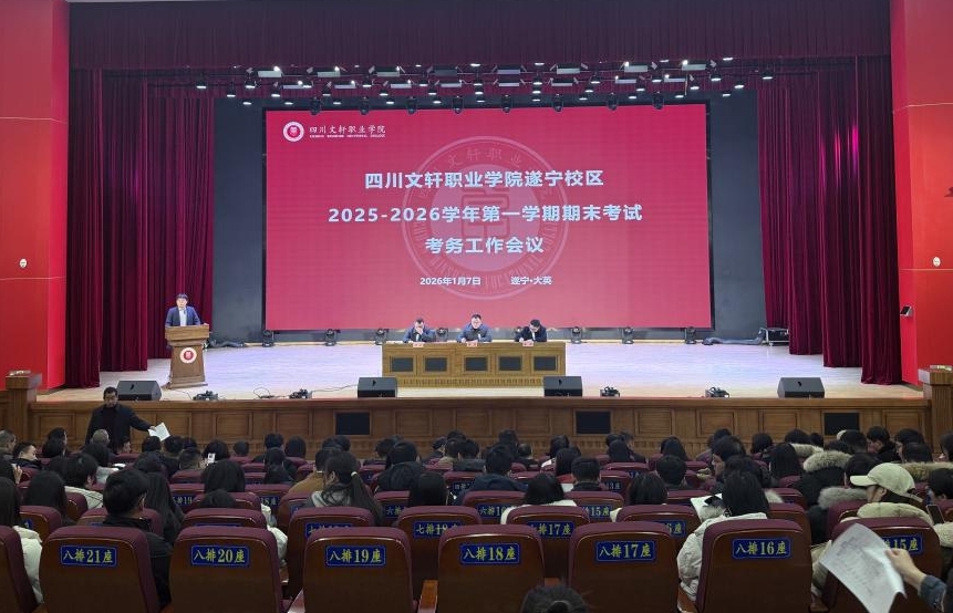 2026 年 1 月 7 日,学院教务处在成都校区和遂宁校区同时组织召开2025-2026 学年度上期期末考务工作专题会议,副校长、遂宁校区校长周勇,校长助理、成都校区副校长周红中,校长助理、遂宁校区副校长张毅,遂宁校区副校长何波,两校区教务处、学生处、科研(质控办)处、教学单位负责人、全体教师和辅导员参加会议。成都校区会场由教务处副处长、校区教务处处长周开银主持,遂宁校区会场由科研处(质控办)副处长、校区科研处(质控办)处长管洋主持。